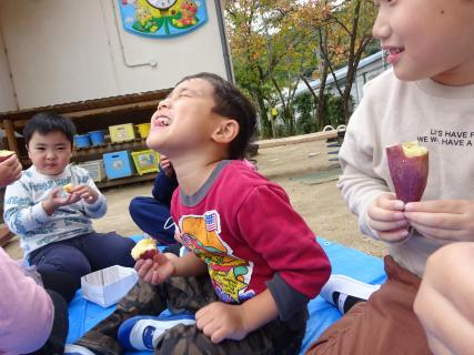よく晴れ、暖かい日となりました。今日は保育園の焼き芋大会の日でした。先日、ぱんだ組さんが洗ってくれたお芋を 今朝はお遊戯室でぱんだ組さんが中心となって全員がお芋の濡れ新聞・ホイル巻きをしてくれました。たくさんお芋があったのですが、丁寧に巻いてくれました。その間園庭では焼き芋用の「熾き」を作っておき、ちょうど「熾き」が出来上がった頃、お芋を巻き終える事ができました。そして子供たちが巻いてくれたお芋を熾きの中にいれ、蒸し焼きをすると ほんわり甘~い「焼き芋」ができました。今日のお芋はトロトロっという表現が当てはまるほど、やわらかく蒸し焼く事ができました。出来上がった焼き芋は園庭で早速味見をしました。熱い熱いと言いながらも「おいしい」と何度もお代わりをせがむ子ども達でした。