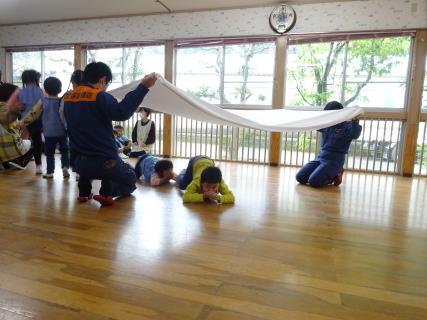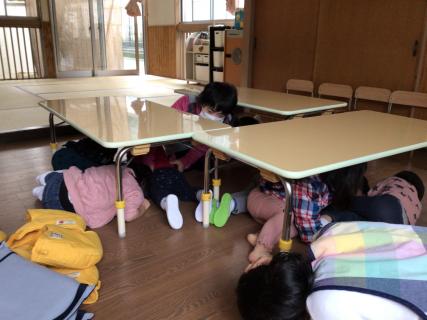 土砂災害を想定した避難訓練を行いました。今回は職員が山が崩れるのを発見し、それを園内にいかに素早く伝えて、且つ避難するかをねらいとして行いました。放送で「山が崩れ、避難が必要であること」を伝えると、各クラスとも静かに職員のもとに集まり、防災頭巾を被って避難への活動に移す事ができました。お遊戯室に避難し終えた後、改めて「避難時の約束『おはしもて』」の言葉の意味を皆で確認を行いました。また土砂災害や自然災害の怖さを子ども達に伝えていると、最近の伊豆諸島近辺を通過した際の被害の様子をテレビで見た事がある子は「家がつぶれとった。屋根が飛んどった」と怖さをリアルに関していたようでした。