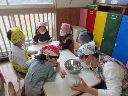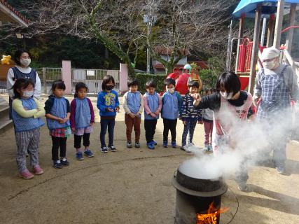 毎年恒例の「お餅つき」を行いました。今年は2臼つきました。2クラスずつお遊戯室に集まり、お餅をつく様子を見せてもらい、その後小さな杵をもってお餅をつかせてもらいました。ドスン、ペッタンと大きな音がすると自然に「がんばれ」とつきての応援する声が聞かれました。またつきたてのお餅を触らせてもらったり、やわらかさを確かめたりさせていただきました。