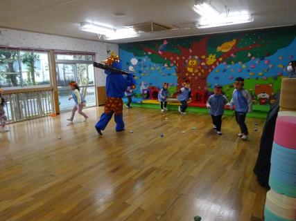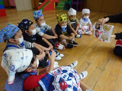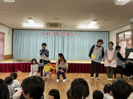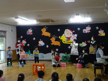 12月生まれの子のお誕生日会をしました。今月誕生日を迎える5人のうち3人が前に出て皆から「おめでとう」と言ってもらいました。また職員からの出し物は「八百屋さん」のパネルシアターで八百屋にある物、ない物をリズムに合わせて応える遊びを行いました。意外な品物が出てきて子ども達も楽しんでいました。12月に入り、外は急に寒くなりましたが、お誕生日会の雰囲気はとても暖かく、たくさんの笑顔が見られたお誕生日会が行えました。