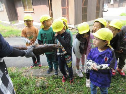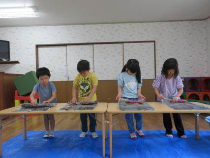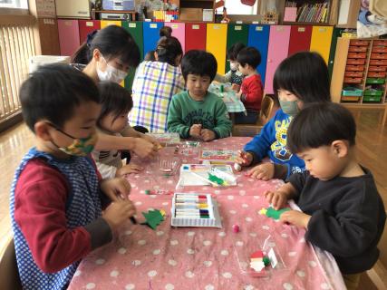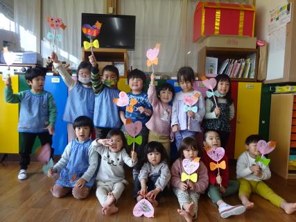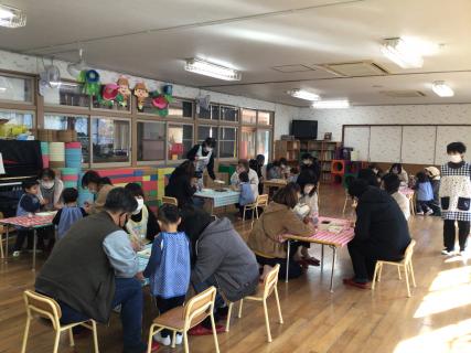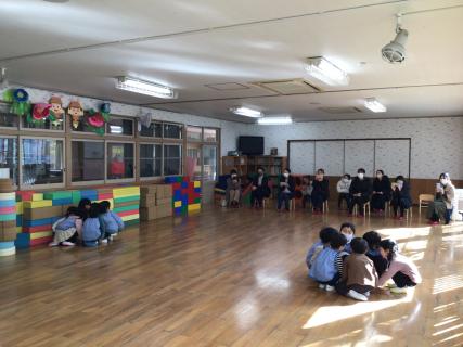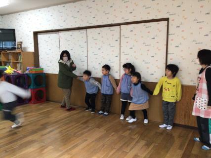 きりん組、ぱんだ組の子ども達が同じ宮村地区にある「特別養護老人ホーム 天橋園」に訪問させていただきました。毎年訪問をさせていただだいており、楽しみにしておられた方もいらっしゃったようです。また子ども達にとっても、「鯉のおる所」となじみのある所でもあり、今日も交流会が始まるまでの間、しばらく鯉を見せていただいていました。いざ交流会が始まり、最初のうちは緊張もあり声も小さかったのですが、徐々にいつもの元気が出てきて、最後には元気な姿を見ていただく事が出来ました。最後に子ども達が作った『小物入れ』をプレゼントをして、また来年来させていただく事を約束し、帰ってきました。短い時間ではありましたが、子ども達にとって良い経験となったようです。