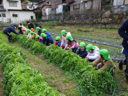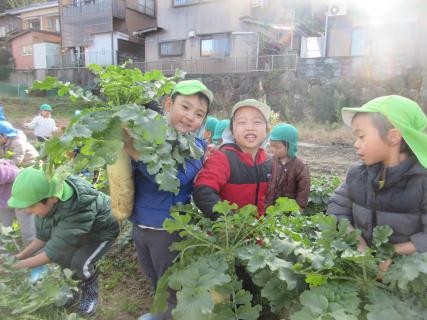 保育園の「大根」の収穫を行いました。10月の「さつまいも」が不作であったので、今回はどうかな?との心配があったおですが、その不安を吹き飛ばすほどの大豊作でした。天気が良かった事もあり2歳児クラスから上の子ども達が保育園の畑まで行き、「大根」の収穫を行いました。畑につくなり、子ども達は「大根が土から見えている、めっちゃ大きい」と驚き、土の中を掘って収穫する「お芋」との違いに気づいたようです。そして大根の葉を揺すりながら引き抜くと大きな大根がとれました。子ども達の中で「大きなかぶ」に出てくる【かぶ】と【大根】の違いをイメージしながら大きな大根の収穫を行いました。たくさん採れた大根は子ども達がお土産に持って帰る事にしたのですが、大根のあまりの大きさに準備していただいたビニール袋に入らなかった子がたくさんいました。