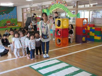 今年度の縦割り保育は内容を見直し、『仲良しデー』と『クッキングおやつデー』という交流日を設けています。仲良しデーとは、午前中から縦割りグループで過ごし、昼食終了後まで一緒に過ごす日を言います。(ちなみに「クッキングおやつデー」はクッキングの日に2クラスずつ分かれ、3つのグループでおやつを食べる日を言います) さて今日はその「仲良しデー」の日でした。運動会の練習などもあり、しばらくの間、縦割り保育活動が行えていなかったのですが、それぞれのグループの部屋に分かれても大きなトラブルもなくスムーズに縦割り保育が行えたように思います。天気が良かった事もあり、園庭でシャボン玉をするグループ、グランドで三輪車遊びをするグループ、お散歩に出かけるグループ、そして園内ではミニ運動会をするグループ、制作をするグループなど、それぞれ工夫をこらして触れあいました。またそれぞれのグループで大きい組さんが小さい組さんのお世話をするほほえましい姿が見られました。