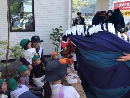 収穫体験の後は由良にある「特別養護老人ホーム 安寿の郷」へ訪問させていただきました。大勢のおじいちゃん、おばあちゃんが楽しみに待っていてくださったようで、子ども達の唄や踊りが終わるたびにたくさんの温かい拍手をいただきました。子ども達も緊張していたみたいですが、いつもの元気な様子を見ていただく事ができて、大きな自信となりました。発表が終わり、お弁当の時間まで時間があったので、由良の浜に行かせてもらいました。今日は風が強く波も高かったのですが、大きな砂浜でかけっこしたり、鬼ごっこしたりして、とても楽しかったようです。お昼ご飯は園から運んでもらったお弁当を、安寿の郷さんのフロアで食べさせていただきました。お腹がすいていたようであっという間に食べてしまいました。昼食後は帰りの汽車の時間まで今度は由良の街探索という事で近くの神社に行かせてもらいました。今回の丹後由良訪問は行きの汽車の中を含めて、本当に大勢の方の協力していただき、子ども達にとっても楽しい行事となりました。収穫した実は保育園で「搾油体験」をさせていただく予定です。