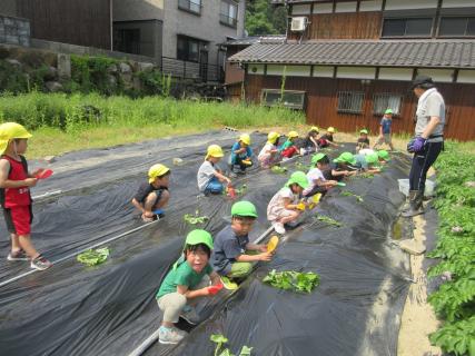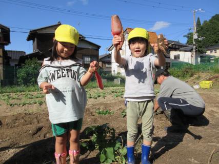 さて今日は5歳児ぱんだ組さんは午前中は宮津市のAETさんによる「プレイイングリッシュ」、そして午後は「さつま芋の収穫」をしてくれました。まず「プレイイングリッシュ」ですが、今日は動物の英単語を教えてもらいました。ドックや、キャット、ピッグなどの英単語を使ってゲーム感覚で英語に触れ合いました。さて午後からの「さつま芋ほり」、本来なら園児全員で行いたかったのですが、今年はまれにみる不作(少雨・高温が影響したのでしょうか)、畑の15分の1くらいのスペースしか根がつかず、今回はぱんだ組さんだけの収穫となりました。実の数が少なかった分、大きなおいもができており、一人では掘る事ができず、「おおきなカブ」のように3~4人の子ども達が力を合わせて蔓を引っ張り、おいもを掘りました。収穫したお芋は保育園玄関口に飾ってあります。ぱんだ組さんには次のミッション「柿の収穫」を10月14日に行う予定です。こちらは木にたくさんなっているので、大収穫が期待できます。