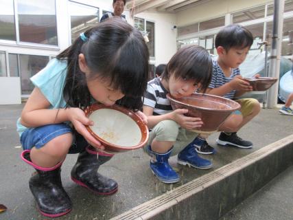 台風の接近により実施があやぶまれた「野外保育」ですが、午前中は台風の影響を受けないと判断し、内容を少し簡略化したものの、予定通り神崎の「まいまいハウス」に野外保育に行くことができました。朝間に少し雨に降られましたが、台風の影響もほとんどなく、楽しい「野外保育」となりました。なによりまいまいハウスへの道中でたくさんの大きな蟹を見つけ、子ども達はペットボトルで作ったかばんに、「お土産にする」のだと捕まえた蟹をいれていました。その他、今回の野外保育ではかぶと虫やバッタ、とんぼ、ちょうちょ、へび、青虫等のたくさんの生き物を見つける事ができ、屋外ならではの体験を行う事ができました。
