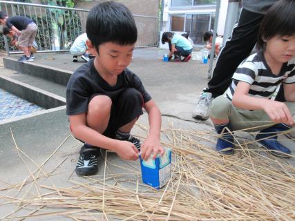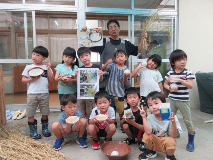 避難訓練の後、ぱんだ組さんは、9月9日に刈り、天日干しをしておいた稲の脱穀・もみすり体験を行いました。写真を見て、刈りたての稲の色と干しておいた稲の色を見比べて「緑」⇒「茶色」になっている事を皆でっ確認した後、「脱穀体験」を始めました。ペットボトルや牛乳パックを使って、籾をこすり落とす(脱穀)、それをすり鉢の中に写し、軟式野球ボールを使って「もみがらと玄米を分ける(もみすり)」を子ども達が行いました。最初は「難しい、できん」と言っていましたが、慣れてくるとみんな上手にできるようになり、最後には、たくさんの「玄米」をとる事ができました。特に、もみ殻を吹き飛ばす際の「フ―」という作業が子ども達にとって楽しかったようです。