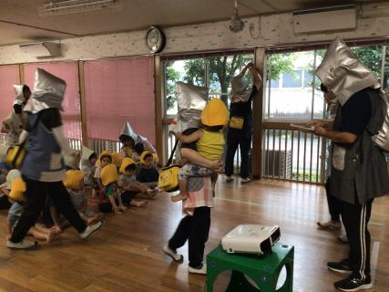 最近のニュースでは日本のいたるところで、大雨や突風による被害を伝えています。保育園の子ども達もそんなニュースの内容を知っており、「雨がいっぱい降って、家の中に水が入っとった」「風が吹いて、家の壁が飛んどった」と教えてくれます。そこで今月は「風水害を想定した避難訓練」を行いました。子ども達はいつも通り、放送の指示を聞いて素早く避難をする事ができました。今回は、より子ども達に興味深く、そして真剣に学んでほしくて、『ポケモン』のキャラクターを用いた映像教材を使って、「風水害が来る前の備え」「雨・風が強い日には外に出ない」という大切な約束を皆で確認しました。