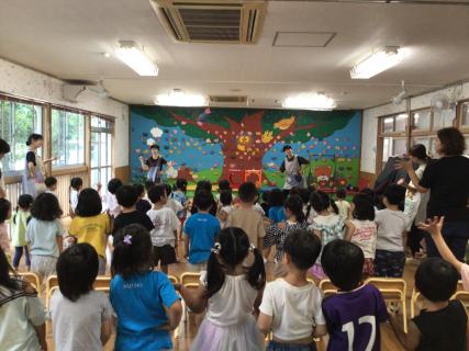 今日は8月生まれの子のお誕生日会を行いました。今月誕生日を迎えるのは6人、一人ずつインタビューをしてもらい、皆から「おめでとう」と言ってもらいました。その後の職員からの出し物は「ばけたくん」のペープサート、子ども達も大好きなお話で、変身するたびに子ども達は大喜びでした。