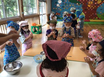 今年の夏、たくさんの陽を浴びて夏野菜は大きく、そしてたくさんの実をつけました。そんな興味より、今月のクッキングは、ピーマン、なす、プチトマトなどを使った「夏野菜ピザ」を作りました。今回の行程は「野菜を切る」「ピザ生地を麺棒で伸ばす」「切った夏野菜をトッピングする」の3行程で行いました。クラスごとで行ったのですが、どのクラスも丁寧に包丁や麺棒を扱い、上手にピザを作る事ができました。3時のおやつに食べたのですが、日ごろは「なすが苦手」「トマトは嫌い」と言っている子も「おいしい、おいしい」と言って食べていました。旬の食材を用いる事で、食物への関心を深める事ができました。