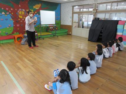 5歳児を対象に実施されている英語指導「プレイングイングリッシュ」ですが、今日から講師を務めていただく先生がアリー先生からジェシカ先生に変わりました。今日初めてジェシカ先生にお会いするという事で、今日の指導はまずお互いの自己紹介から始めました。今日に備えて英語の紹介は「マイ ネーム イズ ~」と覚えていたのですが、いざジェシカ先生を前にするとちょっぴり緊張してしまい、小さい声での自己紹介となってしまいましたが、「質問コーナー」では「好きな食べ物は?」「アメリカには何があるの?」などいくつもの質問をさせていただきました。お互いがリラックスした後、皆が知っている「はらぺこあおむし」のお話をジェシカ先生の英語版と保育士による日本語版を交互に読み聞かせてもらい、言葉の違いを耳で感じていました。最後に『ティンクル、ティンクル リトルスター』の唄をみんなで歌い、とても楽しい時間となりました。次回は10月15日に来られる予定です。