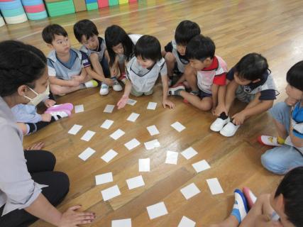 朝の全体遊び終了後、全園児がお遊戯室に集まり、運動会に歌う歌と親子で行う「にこにこエクササイズ」の練習を行いました。歌はこれまでも何回か練習を行っており、大きな声で歌えていました。「にこにこエクササイズ」は初めて行いましたが、格調ある音楽(?)に併せて「シュッワチ」や「ヒラヒラ」などの声掛けに併せて楽しみながら練習を行いました。全体練習の後は3~5歳児クラスがメリヤス跡に移動し、初めての3クラス合同リレーの練習を行いました。3~5歳児クラスを4つの縦割りグループに分けてチームを編成したのですが、初めての練習の割には、コースを間違える子もなく、追い越し追い越されながらの発熱したリレーとなりました。9月に入ると園児全体の練習を行いながら、当日の運動会に向けて子ども達の士気を高めていきたいと思います。