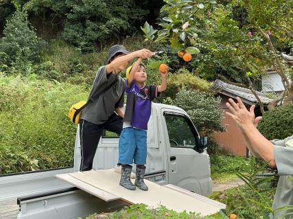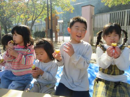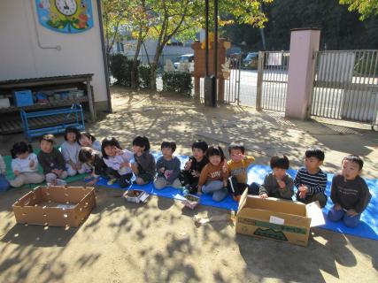 先日の「さつま芋」は全くの不作でしたが、そのリベンジとして、本日柿の収穫をぱんだ組さんがしてくれました。実際に子ども達が木から柿をとるのではなく、職員が高枝切ばさみで落とした「柿」を拾い集めてくれました。柿の実が木になっている所を見た事がある子も少なく、貴重な体験となりました。拾い集めてくれた柿はぱんだ組さんが数えてくれ、116個もありました。秋の味覚のおすそ分けという事で、各世帯に2個ずつお土産に持ち帰る事としました。