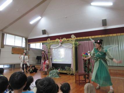 宮津小学校2年生の生徒さんが、みずほ保育園に来てくれ、授業で学んでおられる「お手紙」というお話の劇を見せてくれました。保育園を代表して ぱんだ組さんが見せてもらったのですが、最初はとても緊張ぎみでした。それでも劇を見せてもらった後の感想交流では「良かった」「かっこよかった」と感想をいう事ができました。そしてその後のふれあいの時間では「じゃんけん列車」や「猛獣狩り」をしました。そのころにはすっかり緊張も解け、笑顔が随所に見られ、小学校に進学する事への憧れの気持ちが大きくなりました。