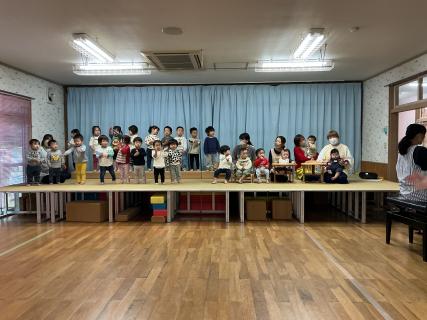 11月29日に行う「乳児クラスの発表会」に向けて第1回目の全体練習を行いました。まだまだ練習段階で、ステージに立つだけで涙が出てしまう子もいましたが、3クラス合同の「音楽遊び」では楽しく楽器や手拍子をして楽しく振舞う事ができました。これから乳児クラスは3回の全体練習を経て、29日の発表会を迎えます。ちなみに幼児クラスは12月6日(土)の発表会に向けて 5回の全体練習を行います。練習を重ねて日々上達し、本番で素敵な唄・演技を見せてくれるのが楽しみですね。