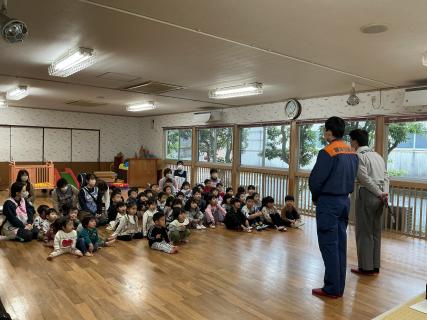 宮津消防署の方にお越しいただき、「防火教室」が行われました。久しぶりの避難訓練となりましたが、最近ニュースなどで伝えらえる「大火事」の様子を知っている子もおり、皆真剣に取り組むことができました。10時15分に保育園の機械室から火が出て想定で訓練を行ったのですが、きちんと放送の内容を聞き分け「おはしもて」の約束を守って避難する事ができました。消防署の方からも避難が上手にできていると褒めていただきました。そして「防火教室」、今回は「〇×クイズ形式」で避難時の約束を確認しました。「火事の時には走って逃げる」といった引っかけ問題もありましたが、子ども達は真剣に判断し、正解の時には喜び、不正解の時には「なぜだろう」と振り返る事ができました。「〇×クイズ」の後は煙に見立てた白いシーツの下を這って避難する練習を行いました。最後に「おはしもて」の歌を皆で歌い、『避難時の約束』『命を守る術』について確認をしました。今回「防火教室」のお礼に、日ごろの感謝の気持ちを伝えるため、「手作りティッシュカバー」をプレゼントしました。