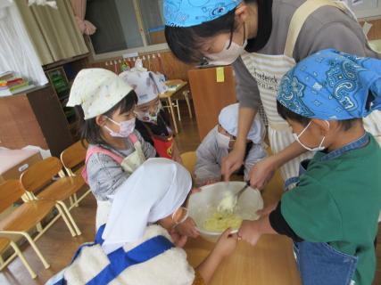 9月のクッキングは「旬の果物を使った物を」という事で、『梨マフィン』を作りました。そのまま食べてもおいしい梨ですが、各グループ「昨日も梨食べたで」「切った梨の皮がヘビみたい」と賑やかにクッキングを行う事が出来ました。出来上がったマフィンはとても甘くて美味しかったです。