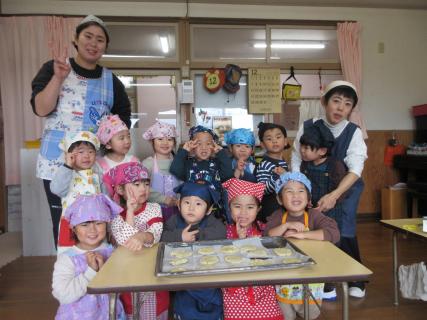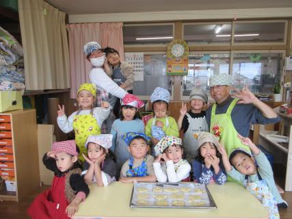 毎月1回行っている「クッキング」、今月は保護者の皆様に教えていただいたメニューを参考に「ひじき・ごまクッキー」を作りました。子ども達にとって、【ひじき】という食材の名前は聞いたことがあるものの、意識して見る事は少なく、乾燥した「ひじき」を見せてもらうと、「髪の毛みたい」と言っていました。またそれを水に浸すと少しずつ広がり、大きくなる様子は子ども達には驚きであったようです。また「ひじき」のにおいをかいだり、色の変化をみていました。今回は感染症拡大予防のためにクラス毎で実施したのですが、クッキーを作る要領はどのクラスも把握しており、色んな形のクッキーができました。最後にそれぞれ形どったクッキーの生地にごまを振りかけ、「ひじき・ごまクッキー」が完成しました。今回のように保護者の皆様にも協力いただき食への関心を深め、地元の食材、旬の食材、食の栄養などについても子ども達と関心を深めていきたいと思います。