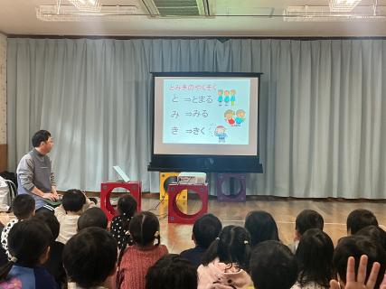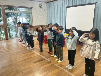 令和8年が始まって1週間経ちました。今日は「1月生まれのお誕生日会」と「交通教室」を行いました。今月お誕生日を迎えるのは6人、一人ずつ前に出てインタビューをしてもらいました。その後の職員からの出し物は「十二支」の紙芝居でした。子ども達はいろんな動物が出てくるお話を楽しむと共に、年長組さんは「僕はいのしし、わたしはねずみ」と教えてくれました。