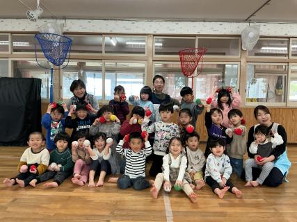 1歳児クラスから5歳児クラスが4つのグループに分かれて「たて割り保育」を行いました。各グループ、「新聞遊び」「お買い物ごっこ」「鬼の玩具製作」「運動遊び」などで楽しく異年齢交流を行う事ができました。12月から参加している1歳児クラス くま組さんもお兄さん、お姉さんにやさしく接してもらいながら参加していました。