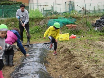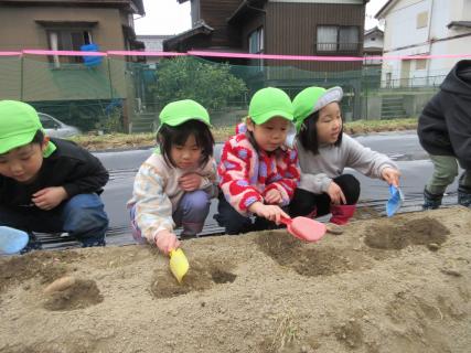 令和7年度もあとわずかになりました。今日は「じゃがいも」の苗植えを行いました。例年全園児が畑に移動し、じゃが芋の苗を植えるのですが、今回は次年度ぱんだ組になる 現きりん組さんだけが畑に行き、苗を植えてくれました。いわば「少数精鋭部隊」です。例年はただ種芋を植えるだけしかしていないのですが、今回は種芋植えの後、マルチを張り、それに土をかぶせて、踏み固めてくれました。いつもは職員がする作業であり、本当に助かりました。今日植えたじゃが芋は、7月頃収穫の予定です。子ども達と「その頃にはぱんだ組さんだね」と進級する事への期待を含めて、「大きくなあれ、おいしくなあれ」と種芋を植えてくれました。