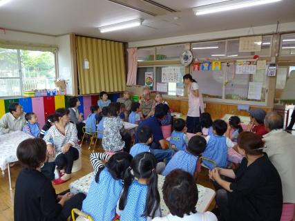 今日は生憎の雨降り日でしたが、本当に大勢の方に保育園まで足を運んでいただき、会場であるお遊戯室に入りきれない方もでるほどの状況でした。これまで運動会の練習が主であり、祖父母参観のための練習はあまりできていなかったのですが、子ども達は大好きなおじいちゃん、おばあちゃんのために歌や踊りを披露する事ができました。全体の発表の後は、各クラスに分かれ、それぞれふれあい遊びを行いました。またお手玉や紙遊び、ぶんぶんゴマを作ったりするクラスもありました。とても楽しい時間となり、あっという間に時間が過ぎたような気がします。見に来られた方にとっても、また子ども達にとっても楽しい参観日となりました。お忙しい中、祖父母参観にお越しいただき、本当にありがとうございました。