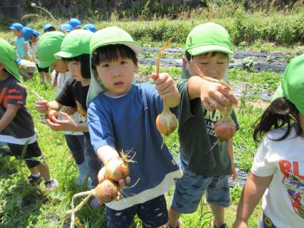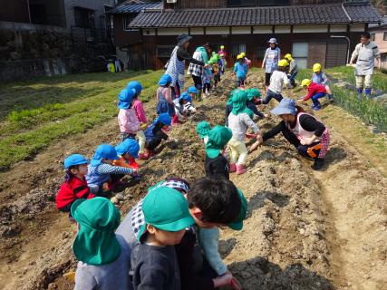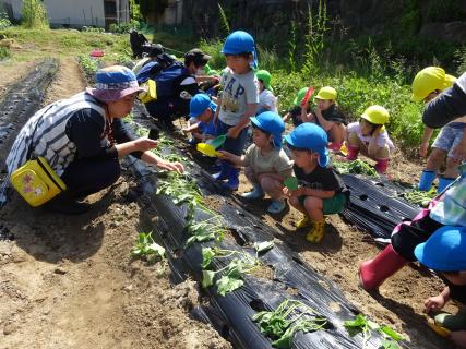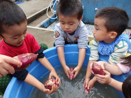 さて今日は5歳児ぱんだ組さんは午前中は宮津市のAETさんによる「プレイイングリッシュ」、そして午後は「さつま芋の収穫」をしてくれました。まず「プレイイングリッシュ」ですが、今日は動物の英単語を教えてもらいました。ドックや、キャット、ピッグなどの英単語を使ってゲーム感覚で英語に触れ合いました。さて午後からの「さつま芋ほり」、本来なら園児全員で行いたかったのですが、今年はまれにみる不作(少雨・高温が影響したのでしょうか)、畑の15分の1くらいのスペースしか根がつかず、今回はぱんだ組さんだけの収穫となりました。実の数が少なかった分、大きなおいもができており、一人では掘る事ができず、「おおきなカブ」のように3~4人の子ども達が力を合わせて蔓を引っ張り、おいもを掘りました。収穫したお芋は保育園玄関口に飾ってあります。ぱんだ組さんには次のミッション「柿の収穫」を10月14日に行う予定です。こちらは木にたくさんなっているので、大収穫が期待できます。