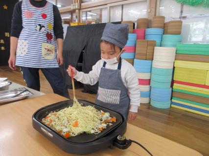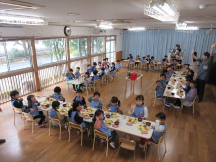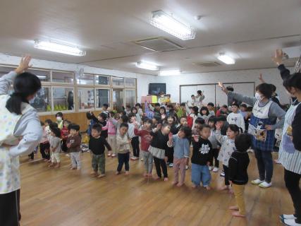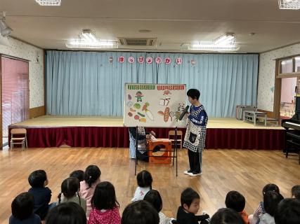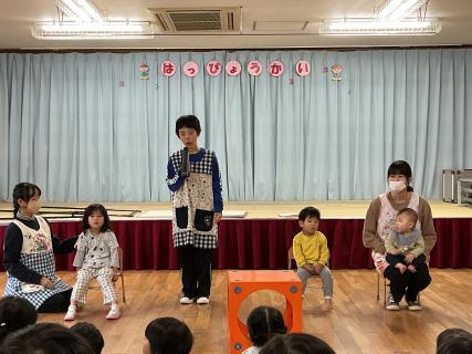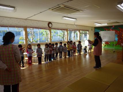 12月生まれの子のお誕生日会をしました。今月誕生日を迎える5人のうち3人が前に出て皆から「おめでとう」と言ってもらいました。また職員からの出し物は「八百屋さん」のパネルシアターで八百屋にある物、ない物をリズムに合わせて応える遊びを行いました。意外な品物が出てきて子ども達も楽しんでいました。12月に入り、外は急に寒くなりましたが、お誕生日会の雰囲気はとても暖かく、たくさんの笑顔が見られたお誕生日会が行えました。