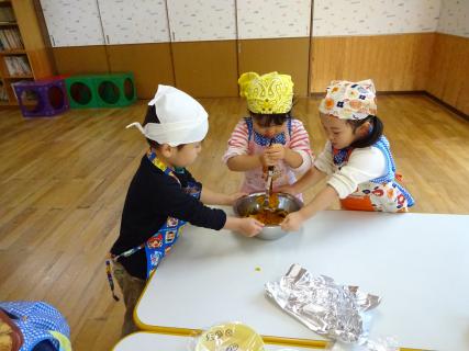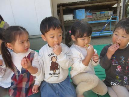 よく晴れ、暖かい日となりました。今日は保育園の焼き芋大会の日でした。先日、ぱんだ組さんが洗ってくれたお芋を 今朝はお遊戯室でぱんだ組さんが中心となって全員がお芋の濡れ新聞・ホイル巻きをしてくれました。たくさんお芋があったのですが、丁寧に巻いてくれました。その間園庭では焼き芋用の「熾き」を作っておき、ちょうど「熾き」が出来上がった頃、お芋を巻き終える事ができました。そして子供たちが巻いてくれたお芋を熾きの中にいれ、蒸し焼きをすると ほんわり甘~い「焼き芋」ができました。今日のお芋はトロトロっという表現が当てはまるほど、やわらかく蒸し焼く事ができました。出来上がった焼き芋は園庭で早速味見をしました。熱い熱いと言いながらも「おいしい」と何度もお代わりをせがむ子ども達でした。