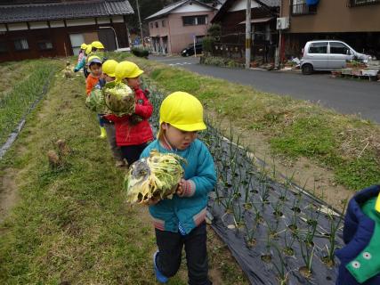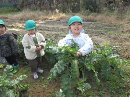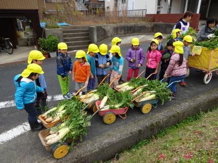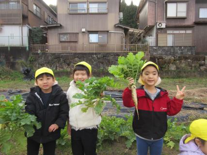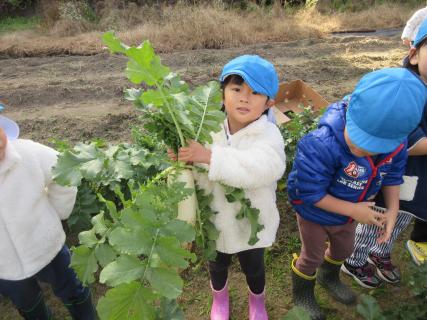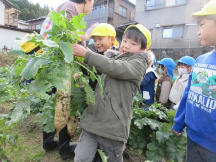 保育園の「大根」の収穫を行いました。10月の「さつまいも」が不作であったので、今回はどうかな?との心配があったおですが、その不安を吹き飛ばすほどの大豊作でした。天気が良かった事もあり2歳児クラスから上の子ども達が保育園の畑まで行き、「大根」の収穫を行いました。畑につくなり、子ども達は「大根が土から見えている、めっちゃ大きい」と驚き、土の中を掘って収穫する「お芋」との違いに気づいたようです。そして大根の葉を揺すりながら引き抜くと大きな大根がとれました。子ども達の中で「大きなかぶ」に出てくる【かぶ】と【大根】の違いをイメージしながら大きな大根の収穫を行いました。たくさん採れた大根は子ども達がお土産に持って帰る事にしたのですが、大根のあまりの大きさに準備していただいたビニール袋に入らなかった子がたくさんいました。