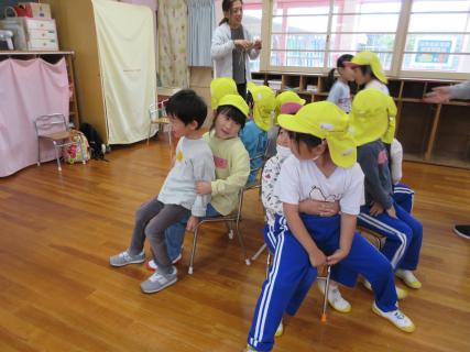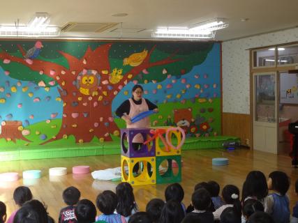 今日は朝から雨が降って少し肌寒い日となりました。今日は宮津学院の取組の一環として、来春 宮津小学校・栗田小学校に進学する子ども達が宮津幼稚園に集まり、平田オリザ氏の劇団の劇を見せていただきました。物の大きさや形といった物がベースとなっており、少し考えさせられるテーマでした。また