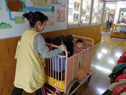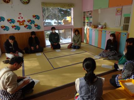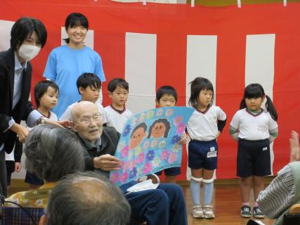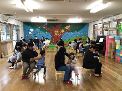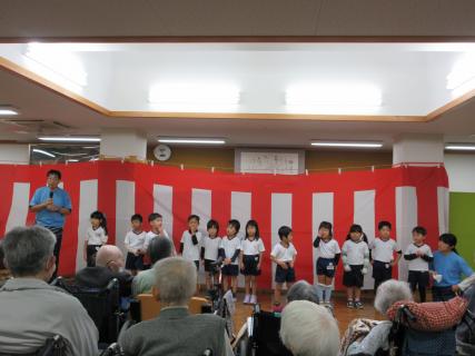 きりん組、ぱんだ組の子ども達が同じ宮村地区にある「特別養護老人ホーム 天橋園」に訪問させていただきました。毎年訪問をさせていただだいており、楽しみにしておられた方もいらっしゃったようです。また子ども達にとっても、「鯉のおる所」となじみのある所でもあり、今日も交流会が始まるまでの間、しばらく鯉を見せていただいていました。いざ交流会が始まり、最初のうちは緊張もあり声も小さかったのですが、徐々にいつもの元気が出てきて、最後には元気な姿を見ていただく事が出来ました。最後に子ども達が作った『小物入れ』をプレゼントをして、また来年来させていただく事を約束し、帰ってきました。短い時間ではありましたが、子ども達にとって良い経験となったようです。