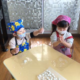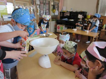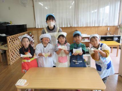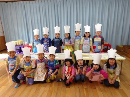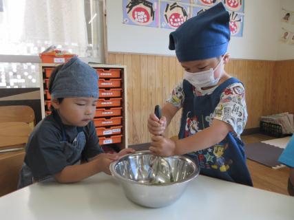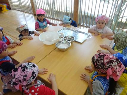 毎月1回行っている「クッキング」、今月は保護者の皆様に教えていただいたメニューを参考に「ひじき・ごまクッキー」を作りました。子ども達にとって、【ひじき】という食材の名前は聞いたことがあるものの、意識して見る事は少なく、乾燥した「ひじき」を見せてもらうと、「髪の毛みたい」と言っていました。またそれを水に浸すと少しずつ広がり、大きくなる様子は子ども達には驚きであったようです。また「ひじき」のにおいをかいだり、色の変化をみていました。今回は感染症拡大予防のためにクラス毎で実施したのですが、クッキーを作る要領はどのクラスも把握しており、色んな形のクッキーができました。最後にそれぞれ形どったクッキーの生地にごまを振りかけ、「ひじき・ごまクッキー」が完成しました。今回のように保護者の皆様にも協力いただき食への関心を深め、地元の食材、旬の食材、食の栄養などについても子ども達と関心を深めていきたいと思います。