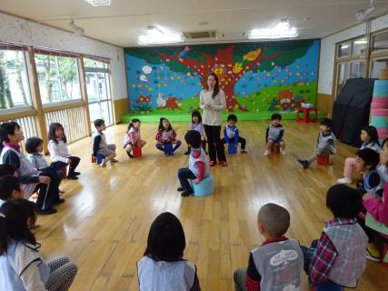 5歳児を対象に実施されている英語指導「プレイングイングリッシュ」ですが、今日から講師を務めていただく先生がアリー先生からジェシカ先生に変わりました。今日初めてジェシカ先生にお会いするという事で、今日の指導はまずお互いの自己紹介から始めました。今日に備えて英語の紹介は「マイ ネーム イズ ~」と覚えていたのですが、いざジェシカ先生を前にするとちょっぴり緊張してしまい、小さい声での自己紹介となってしまいましたが、「質問コーナー」では「好きな食べ物は?」「アメリカには何があるの?」などいくつもの質問をさせていただきました。お互いがリラックスした後、皆が知っている「はらぺこあおむし」のお話をジェシカ先生の英語版と保育士による日本語版を交互に読み聞かせてもらい、言葉の違いを耳で感じていました。最後に『ティンクル、ティンクル リトルスター』の唄をみんなで歌い、とても楽しい時間となりました。次回は10月15日に来られる予定です。