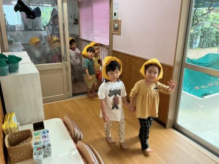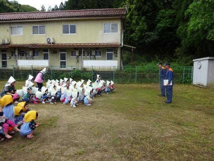 土砂災害を想定した避難訓練を行いました。今回は職員が山が崩れるのを発見し、それを園内にいかに素早く伝えて、且つ避難するかをねらいとして行いました。放送で「山が崩れ、避難が必要であること」を伝えると、各クラスとも静かに職員のもとに集まり、防災頭巾を被って避難への活動に移す事ができました。お遊戯室に避難し終えた後、改めて「避難時の約束『おはしもて』」の言葉の意味を皆で確認を行いました。また土砂災害や自然災害の怖さを子ども達に伝えていると、最近の伊豆諸島近辺を通過した際の被害の様子をテレビで見た事がある子は「家がつぶれとった。屋根が飛んどった」と怖さをリアルに関していたようでした。