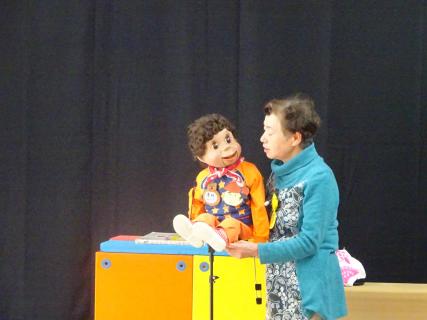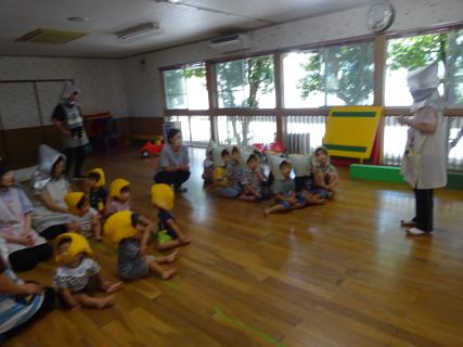 お誕生日会の後は「交通教室」、宮津警察署さんから貸していただきました「ペープサート」を使って行いました。可愛らしいキャラクターでもあり、「道路の歩き方」をしっかり学ぶ事ができました。最後に復習のため「交通安全サンバ」を踊りました。