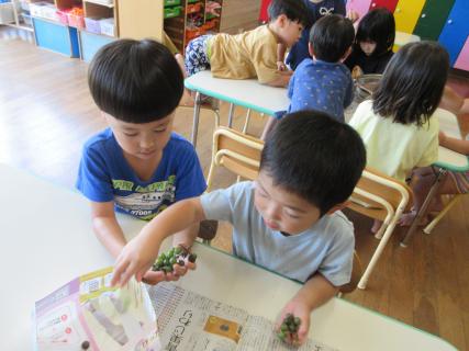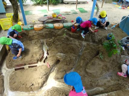 ここ数日天気が優れず、室内で過ごす事が多かったのですが、久しぶりによく晴れました。朝早速子ども達は園庭に出て、虫探しや砂場遊びを楽しみました。久しぶりに遊ぶ園庭は気候も過ごしやすく、汗をかきながらも、秋の訪れを感じさせられました。