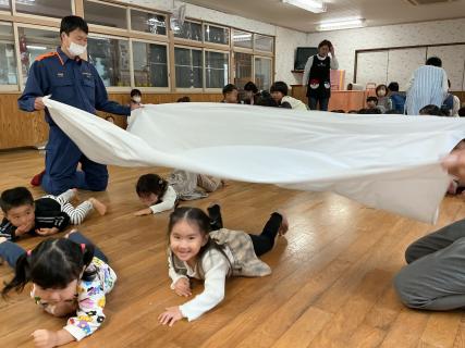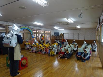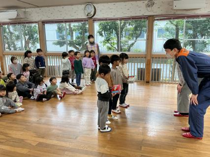 宮津消防署の方にお越しいただき、「防火教室」が行われました。久しぶりの避難訓練となりましたが、最近ニュースなどで伝えらえる「大火事」の様子を知っている子もおり、皆真剣に取り組むことができました。10時15分に保育園の機械室から火が出て想定で訓練を行ったのですが、きちんと放送の内容を聞き分け「おはしもて」の約束を守って避難する事ができました。消防署の方からも避難が上手にできていると褒めていただきました。そして「防火教室」、今回は「〇×クイズ形式」で避難時の約束を確認しました。「火事の時には走って逃げる」といった引っかけ問題もありましたが、子ども達は真剣に判断し、正解の時には喜び、不正解の時には「なぜだろう」と振り返る事ができました。「〇×クイズ」の後は煙に見立てた白いシーツの下を這って避難する練習を行いました。最後に「おはしもて」の歌を皆で歌い、『避難時の約束』『命を守る術』について確認をしました。今回「防火教室」のお礼に、日ごろの感謝の気持ちを伝えるため、「手作りティッシュカバー」をプレゼントしました。