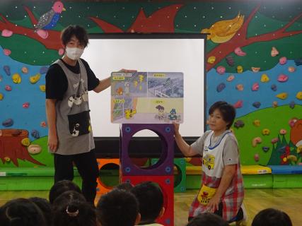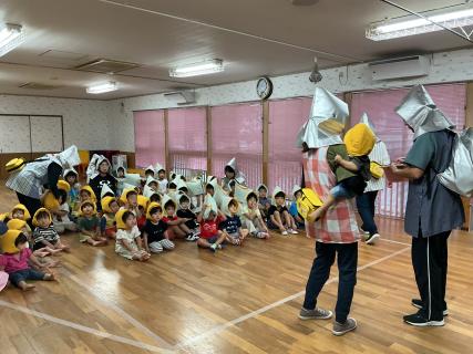 最近のニュースでは日本のいたるところで、大雨や突風による被害を伝えています。保育園の子ども達もそんなニュースの内容を知っており、「雨がいっぱい降って、家の中に水が入っとった」「風が吹いて、家の壁が飛んどった」と教えてくれます。そこで今月は「風水害を想定した避難訓練」を行いました。子ども達はいつも通り、放送の指示を聞いて素早く避難をする事ができました。今回は、より子ども達に興味深く、そして真剣に学んでほしくて、『ポケモン』のキャラクターを用いた映像教材を使って、「風水害が来る前の備え」「雨・風が強い日には外に出ない」という大切な約束を皆で確認しました。