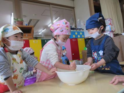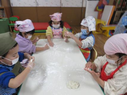 毎年恒例の「お餅つき」を行いました。今年は2臼つきました。2クラスずつお遊戯室に集まり、お餅をつく様子を見せてもらい、その後小さな杵をもってお餅をつかせてもらいました。ドスン、ペッタンと大きな音がすると自然に「がんばれ」とつきての応援する声が聞かれました。またつきたてのお餅を触らせてもらったり、やわらかさを確かめたりさせていただきました。