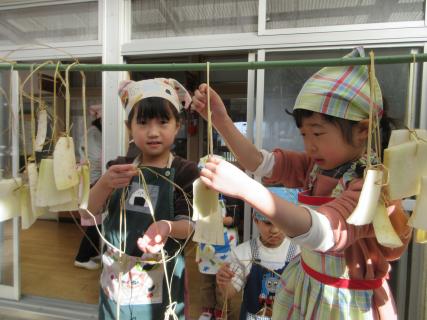今年は立派な「黒モジ」の木をいただく事ができましたので、4本の枝に餅花の飾りをつけさせていただきました。保育園の入り口だけではなく、玄関口にも「餅花」を飾りたいと思います。