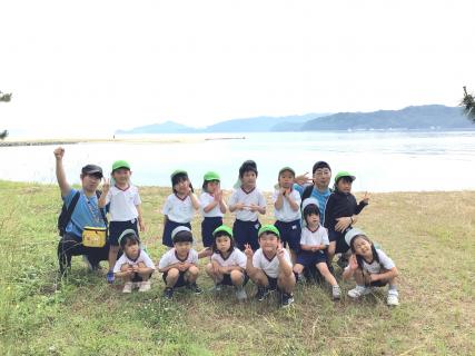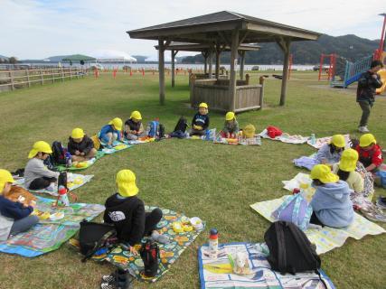 10月とは思えない青空の下、らいおん、きりん、ぱんだ組の子ども達がバスに乗って与謝野町にある「阿蘇シーサイドパーク」に行きました。3歳児クラスのらいおん組さんにとってクラスの子ども達だけで乗る路線バスはとても楽しみにしていたようで、うれしさを隠しきれないようでした。バスから降り、公園までのあるいていると、正面に一面の海(本当は内海ですが…)が見えると、子ども達は一斉に歓声を挙げていました。以前から一度は行ってみたかった公園でもあり、実際に遊んでみると、公園はとても広く且つ緑豊かで大型遊具はもちろん、鬼ごっこなどで走り回って遊ぶ子も大勢いました。