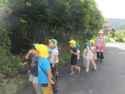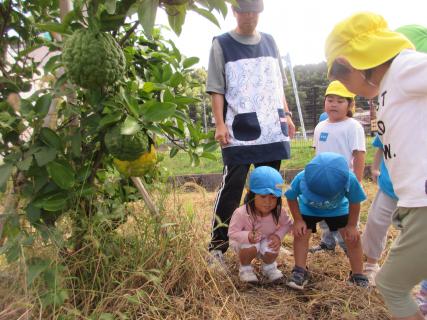 久しぶりの縦割り保育でしたが、年長組さんが自然と年少組さんのお世話をしてくれるなど 思いやりの気持ちが育っているように思います。また年少組さんも年長さんに手をつないでもらい、ペースを守りながら歩き切る事ができました。やはり屋外に繰り出すと、「電車」や「草花」はもちろん、「落ち葉」「溝の水量の変化」などからからも季節の移り変わりを感じさせられます。畑にいったグループは「鬼ゆず」をとってきました。保育園玄関に飾ってありますのでどうぞみてくださいね。