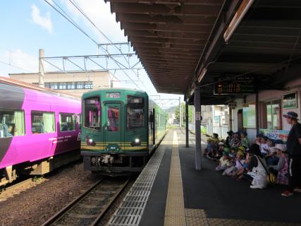 内容を簡略化し、時間を短縮したため、予定していた「浜遊び」や「猛獣狩りなどのゲーム」「まいまいハウスの施設探検」は行う事はできませんでしたが、「スイカ割り」や「大きなお風呂に入る事」はできました。そして野外保育恒例の野菜の丸かじり(きゅうりやトマト)も子ども達にとっては貴重な体験となったようで「おいしい、おいしい」と言って食べていました。また保育園の友達と乗る電車はとても楽しかったようで、窓から見る景色に歓声をあげていました。