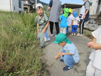 昨夜は強い雨が降り続けましたが、今朝になって雨もあがり良い天気となりました。今日はたて割り保育の日、各クラス 保育園を飛び出し、駅に電車を見に行ったり、畑周辺を歩き秋探しに出かけました。