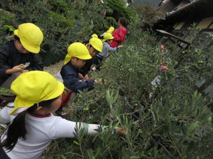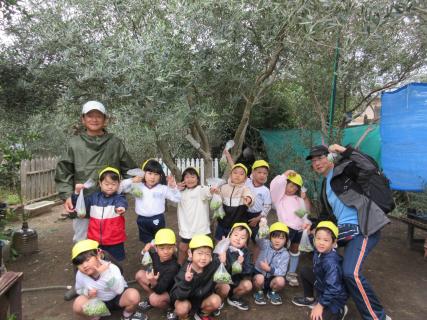 昨年に引き続き、5歳児ぱんだ組さんが丹後由良に行かせていただき、オリーブの収穫、「安寿の郷施設訪問」をさせていただきました。今年はオリーブは豊作の年だったようで、今回も受け入れてくださった新宮さんの庭にはたくさんのオリーブの木にたくさんの実がなっていました。それをぱんだ組さんが収穫をさせていただいたのですが、やる気満々だったぱんだ組さん、ものすごい勢いで収穫してくれ、にわにあったほとんどの実を収穫してくれ、用意していたビニール袋にいっぱいの量を収穫してくれました。