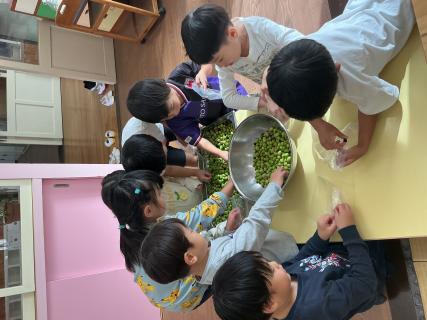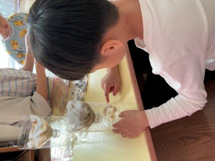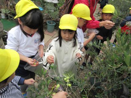 先日収穫させていただいたオリーブの搾油体験をぱんだ組さんがしました。作業自体とてもシンプルで、厚いナイロン袋(ジップロック)にオリーブの実を入れ、ひたすら揉み続け、水分(油分)がにじみ出て来たら、ペットボトルで作った漏斗とキッチンペーパーを使い、濾して油分を抽出します。意外とオリーブの実は固く、もみ潰すのは大変でしたが、「オリーブ油」をたくさん抽出するのだという気持ちから頑張って作業をしてくれました。今日絞ったした水分(油分)は1日おいた後、水面に浮いた油分だけをスポイトで抽出します。子ども達が絞った水分(油分)は保育園玄関口に飾ってあります。果たしてどれくらいの量、「オリーブ油」が採れる事でしょう。