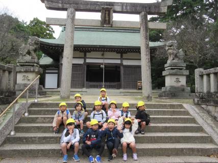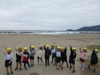 収穫体験の後は由良にある「特別養護老人ホーム 安寿の郷」へ訪問させていただきました。大勢のおじいちゃん、おばあちゃんが楽しみに待っていてくださったようで、子ども達の唄や踊りが終わるたびにたくさんの温かい拍手をいただきました。子ども達も緊張していたみたいですが、いつもの元気な様子を見ていただく事ができて、大きな自信となりました。発表が終わり、お弁当の時間まで時間があったので、由良の浜に行かせてもらいました。今日は風が強く波も高かったのですが、大きな砂浜でかけっこしたり、鬼ごっこしたりして、とても楽しかったようです。お昼ご飯は園から運んでもらったお弁当を、安寿の郷さんのフロアで食べさせていただきました。お腹がすいていたようであっという間に食べてしまいました。昼食後は帰りの汽車の時間まで今度は由良の街探索という事で近くの神社に行かせてもらいました。今回の丹後由良訪問は行きの汽車の中を含めて、本当に大勢の方の協力していただき、子ども達にとっても楽しい行事となりました。収穫した実は保育園で「搾油体験」をさせていただく予定です。