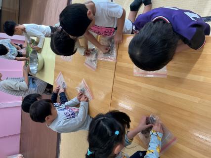 5月から9月までの間、5歳児ぱんだ組を中心に行った「お米作り体験」の集大成として、新米を使った「おにぎりクッキング」を行いました。クッキングの前には「田植え、看板作り、案山子作り、稲刈り、脱穀・籾摺り」の一連のお米作り体験を振り返るため、それぞれの写真や動画をスクリーンに映し、それぞれの体験を振り返りました。スライドで一年を振り返った後は、たて割りグループに分かれて、2種類のおにぎり(具無し、じゃこ入り)を握りました。炊き上がった「ご飯のにおい」や「じゃこの風味」などを確かめながら作りました。そして握ったおにぎりと、給食の先生がつくってくれた【からあげ、ブロッコリー、ポテト、ポークビッツ】をお弁当箱に入れて、園庭でお弁当を食べました。ちょっとしたピクニック気分を味わう事ができて、とてもおいしかったです。