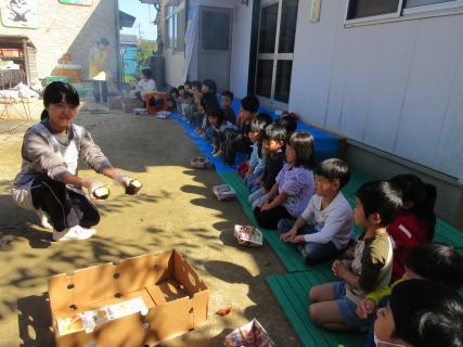 先日の「さつま芋」は全くの不作でしたが、そのリベンジとして、本日柿の収穫をぱんだ組さんがしてくれました。実際に子ども達が木から柿をとるのではなく、職員が高枝切ばさみで落とした「柿」を拾い集めてくれました。柿の実が木になっている所を見た事がある子も少なく、貴重な体験となりました。拾い集めてくれた柿はぱんだ組さんが数えてくれ、116個もありました。秋の味覚のおすそ分けという事で、各世帯に2個ずつお土産に持ち帰る事としました。